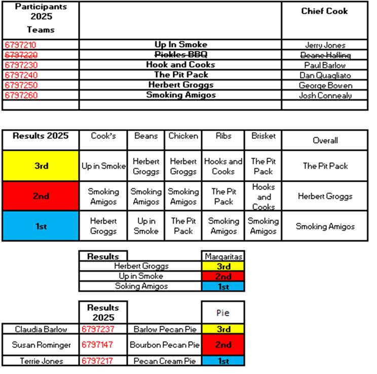 This year the categories to enter are Best Margarita, Pie Bakeoff, Beans, Chicken, Ribs, Brisket and Cooks Choice.